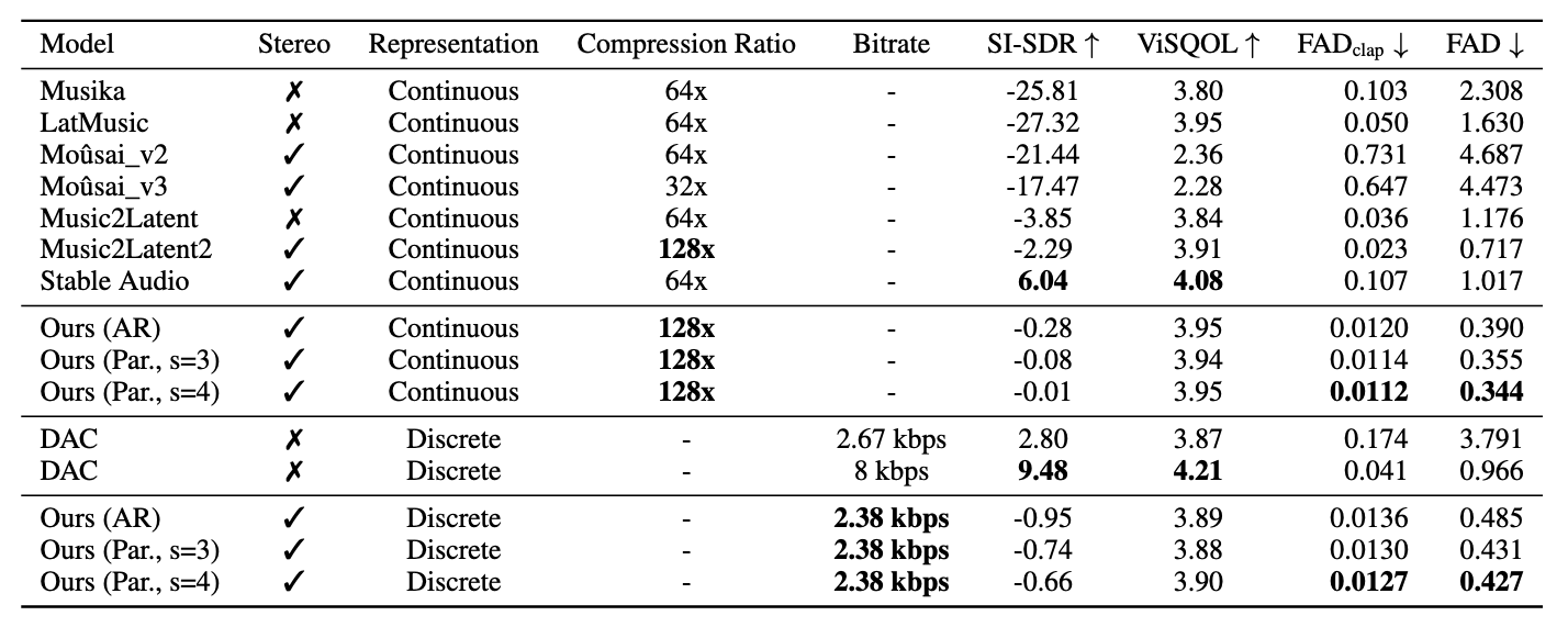 Stereo reconstructions are provided for stereo-capable models: Mousai, Music2Latent2, Stable Audio, and Ours.